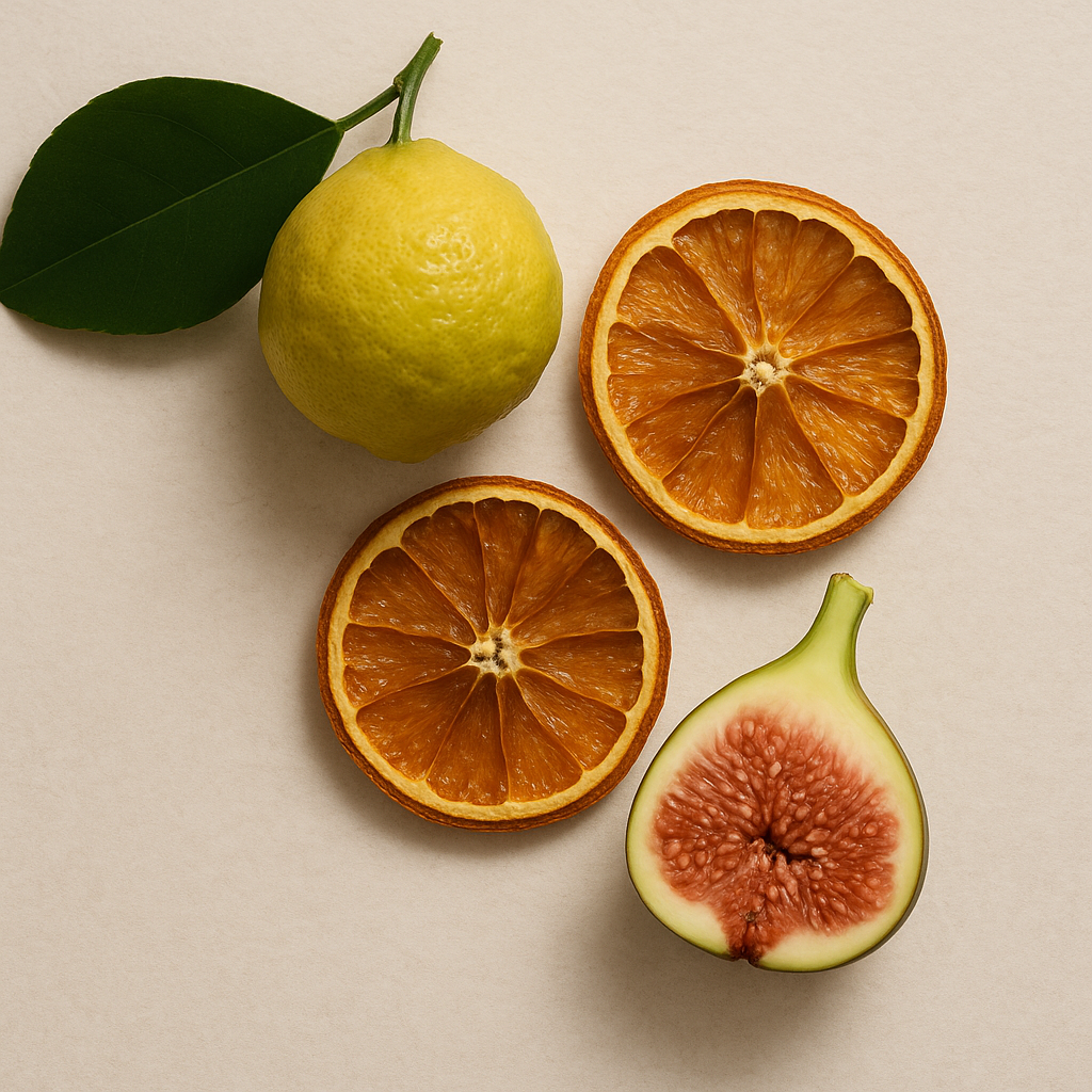 A bright, golden opening that feels like morning light through sheer curtains. The citrus notes shimmer gently, while fig nectar softens their edge, creating a glow that feels both refreshing and serene.