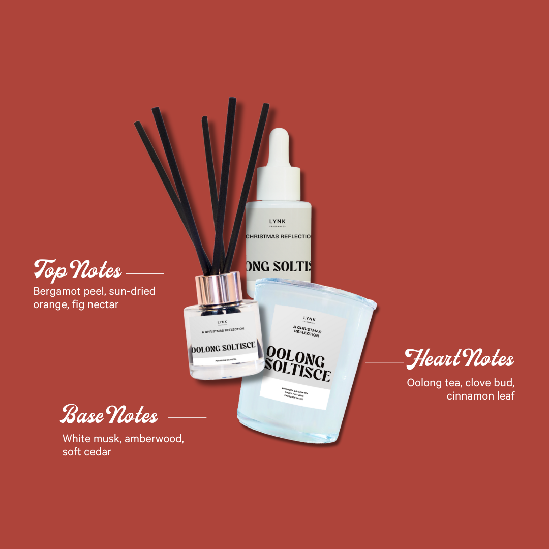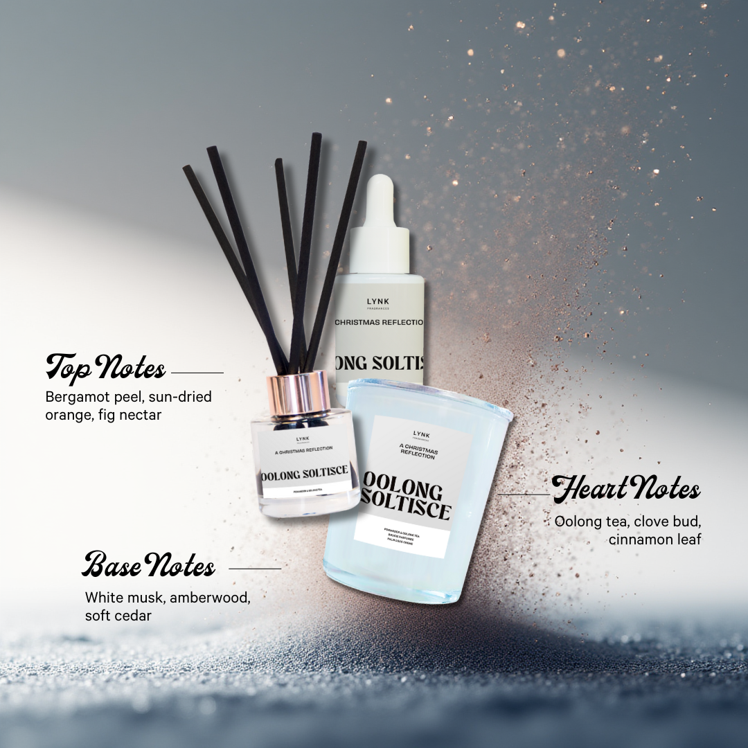 A serene reimagining of festive warmth — where sunlit orange and clove drift through the calm steam of oolong tea. Bergamot brightens; fig nectar softens; white musk lingers like warmth on porcelain.