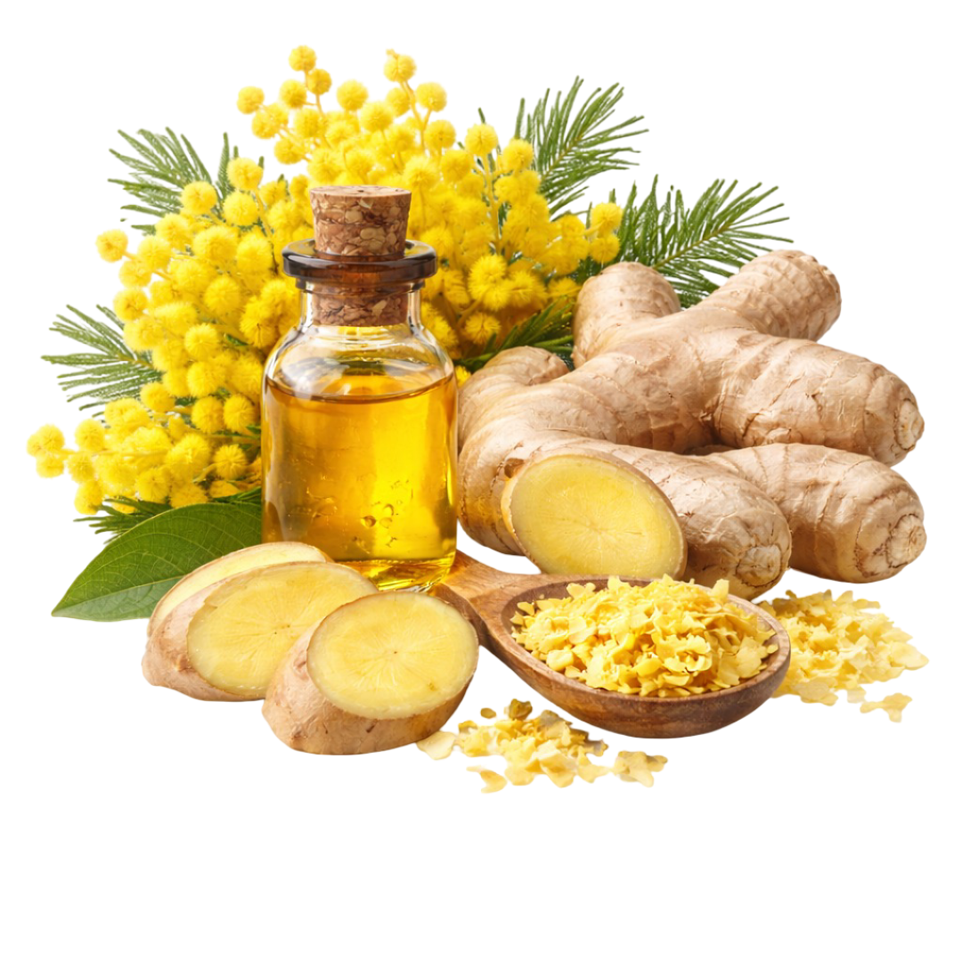 At the heart, mimosa absolute brings a soft, golden glow. Its floral warmth feels like sunlight filtered through sheer curtains. Fresh ginger from India adds a subtle spark that lifts the whole scent, giving it a quiet pulse.
